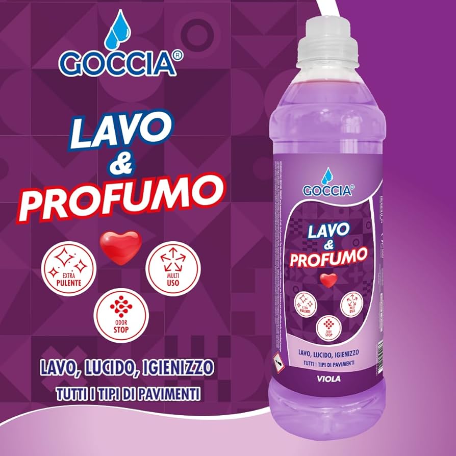Il detergente pavimenti Goccia, linea Lavo e Profumo, è la scelta ideale per chi desidera pavimenti sempre puliti, lucenti e profumati. Con una bottiglia da 900 ml, questo detergente multi-superficie è formulato per lavare, lucidare e igienizzare tutti i tipi di pavimenti, dal parquet alle piastrelle, senza lasciare aloni. Disponibile in quattro colori e profumazioni uniche (blu, rosa, viola e verde), il detergente Lavo e Profumo dona alla tua casa un profumo piacevole e duraturo, trasformando la pulizia quotidiana in un’esperienza sensoriale.